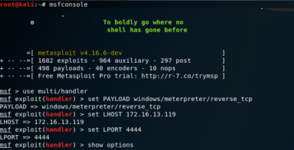Ejecutamos el: use multi/handler (el modo escucha)y seteamos los valores del PAYLOAD, LHOST y LPORT.