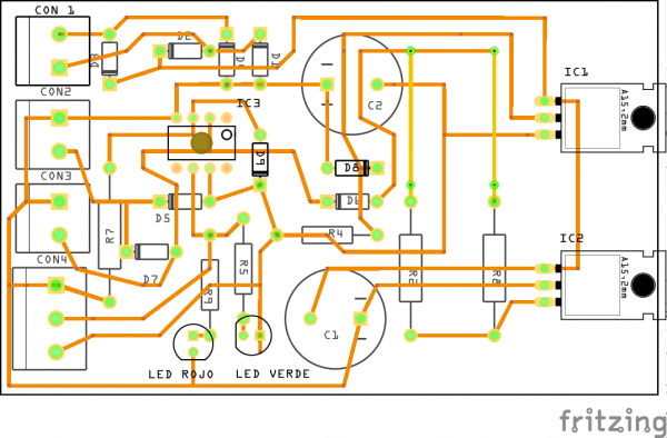 Tenemos que re dibujar la disposición de componentes y también las pistas de cobre, porque con Fritzig no hemos podido colocar el verdadero tamaño de las resistencias cerámicas R2 y R8. Así que exportamos las imágenes desde Fritzing en formato SVG y las capturamos con un programa de dibujo vectorial,
