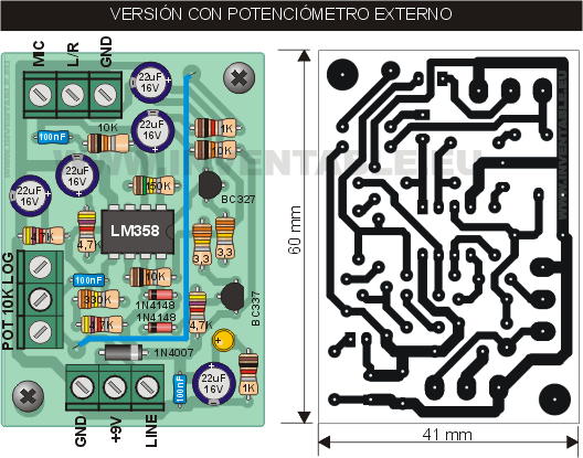 En la figura podemos ver el circuito electrónico de un módulo que usa el conocido circuito integrado LM358. Este integrado contiene dos amplificadores operacionales para uso general. Uno de ellos sirve para amplificar la señal del micrófono mientras que el segundo, junto con los transistores BC327 y BC337 son un pequeño amplificador audio de baja potencia para auriculares con control de volumen.