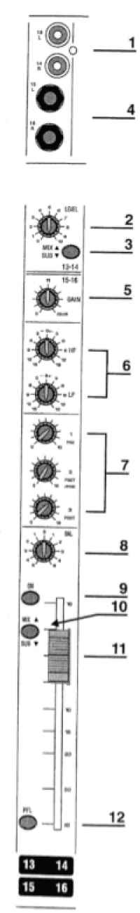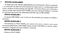 AUX 2 POST/PRE Los canales de entrada ofrecen envíos AUX 2 pre y post-fader, que pueden seleccionarse en toda la mesa en la sección master. Pulse el botón POST/PRE para hacer todos los envíos AUX 2 de los canales pre-fader. Esto significa que no se verán afectados por la posición de los faders del canal, haciéndolos ideales para FOLDBACK o MONITORES. Al soltar el conmutador, los envíos AUX 2 son post-fader, y subirán o bajarán con el fader de canal. Esto es mas adecuado para envíos a efectos, que tienen que desvanecerse con la fuente asociada.