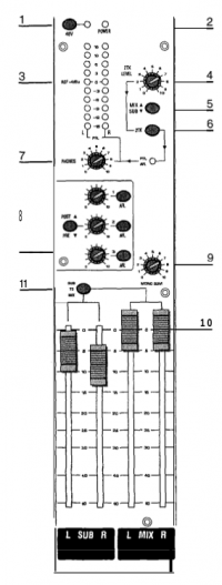 9 SUMA MONO Las señales de mezcla izquierda y derecha se suman en una salida MONO en un jack tipo A de tres polos. El nivel de salida se ajusta con el control rotativo dedicado. Si se requiere la monitorización de la salida mono, puede hacerse en el equipo externo que alimenta o en una entrada libre de la mesa.